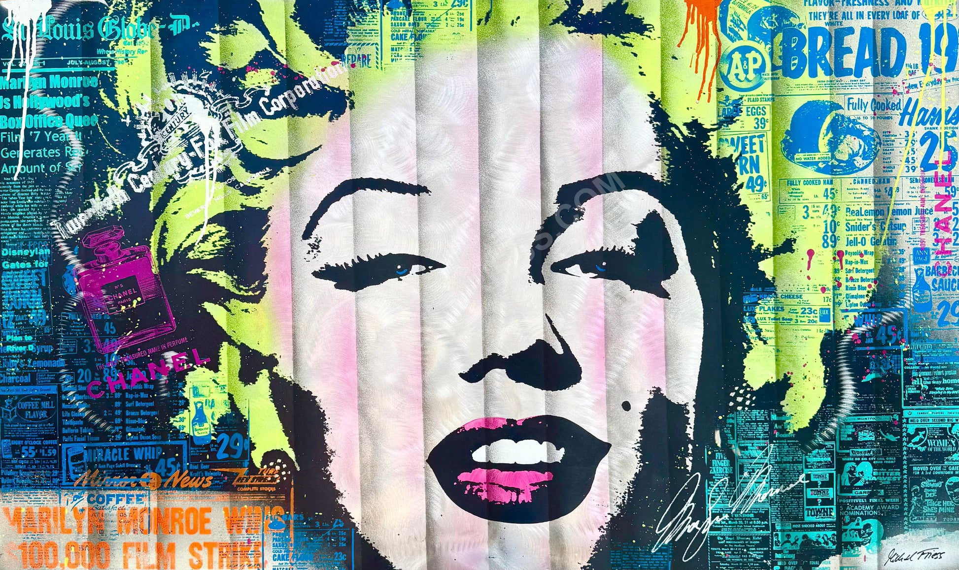 Marilyn Monroe – eine Legende, die bis heute für Glamour, Schönheit und Sehnsucht steht. Dieses Pop-Art-Werk zeigt ihr ikonisches Gesicht in leuchtenden Farben und setzt es in einen spannenden Kontext aus Retro-Prints, Zeitungsfragmenten und Marken-Referenzen. Knallige Neonakzente, Chanel-Parfum und plakative Schriftzüge verbinden Nostalgie mit urbaner Street-Art-Energie. Ein modernes Kunstwerk, das die zeitlose Strahlkraft Marilyn Monroes neu interpretiert – farbstark, rebellisch und voller Symbolik. Ein absolutes Statement-Piece für jede Sammlung.