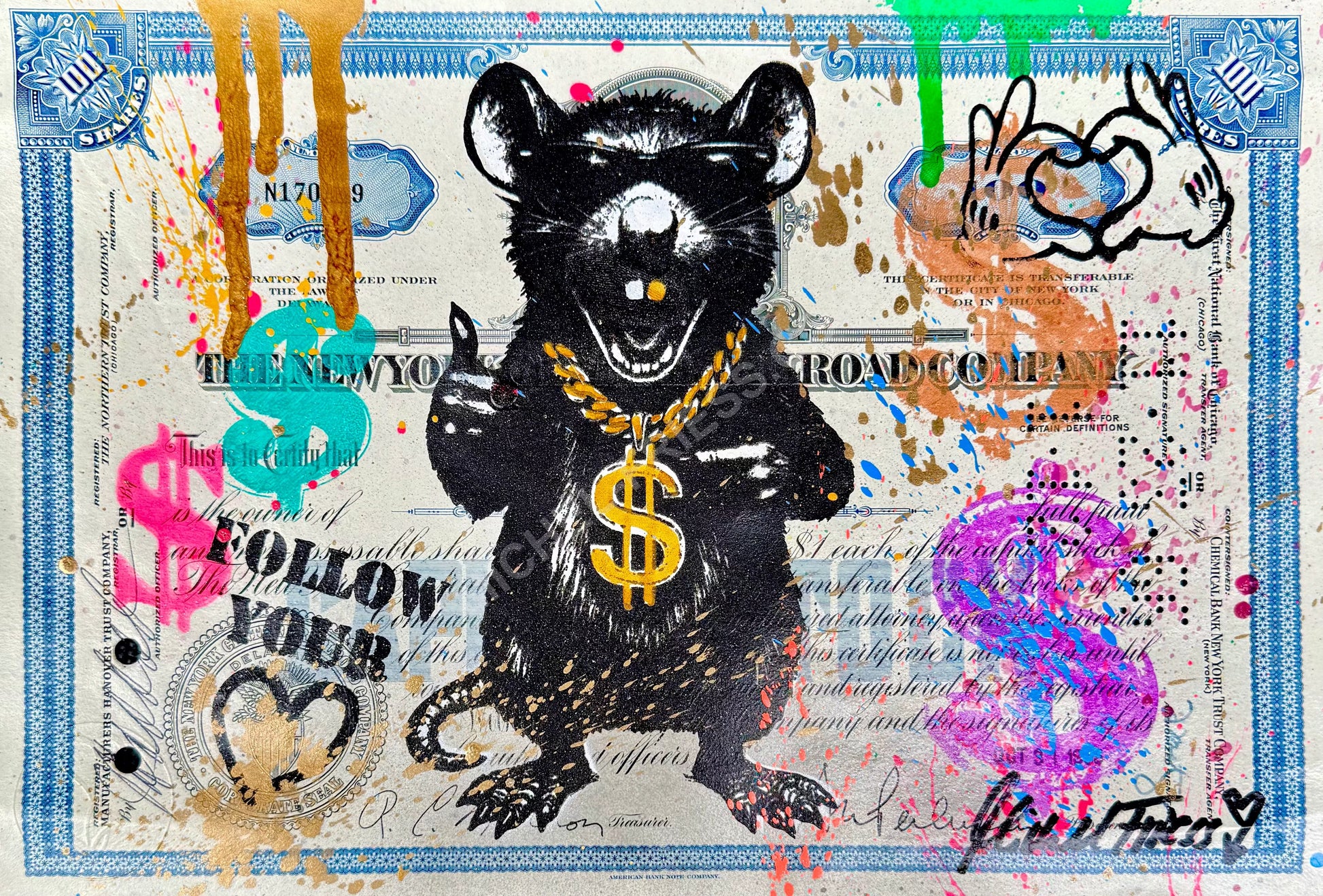 Die DOLLAR RAT steht hier als Symbol für Selbstbewusstsein, Humor und den rebellischen Geist unserer Zeit. Mit Goldkette und Dollarzeichen karikiert er den Umgang mit Geld und Erfolg – frech, urban und voller Energie. Das Werk verbindet Street-Art-Ästhetik mit feinem Detail, provokanter Ironie und dem klaren Appell. Ein starkes Statement-Piece für Sammler, die Kunst mit Haltung und Augenzwinkern schätzen.
