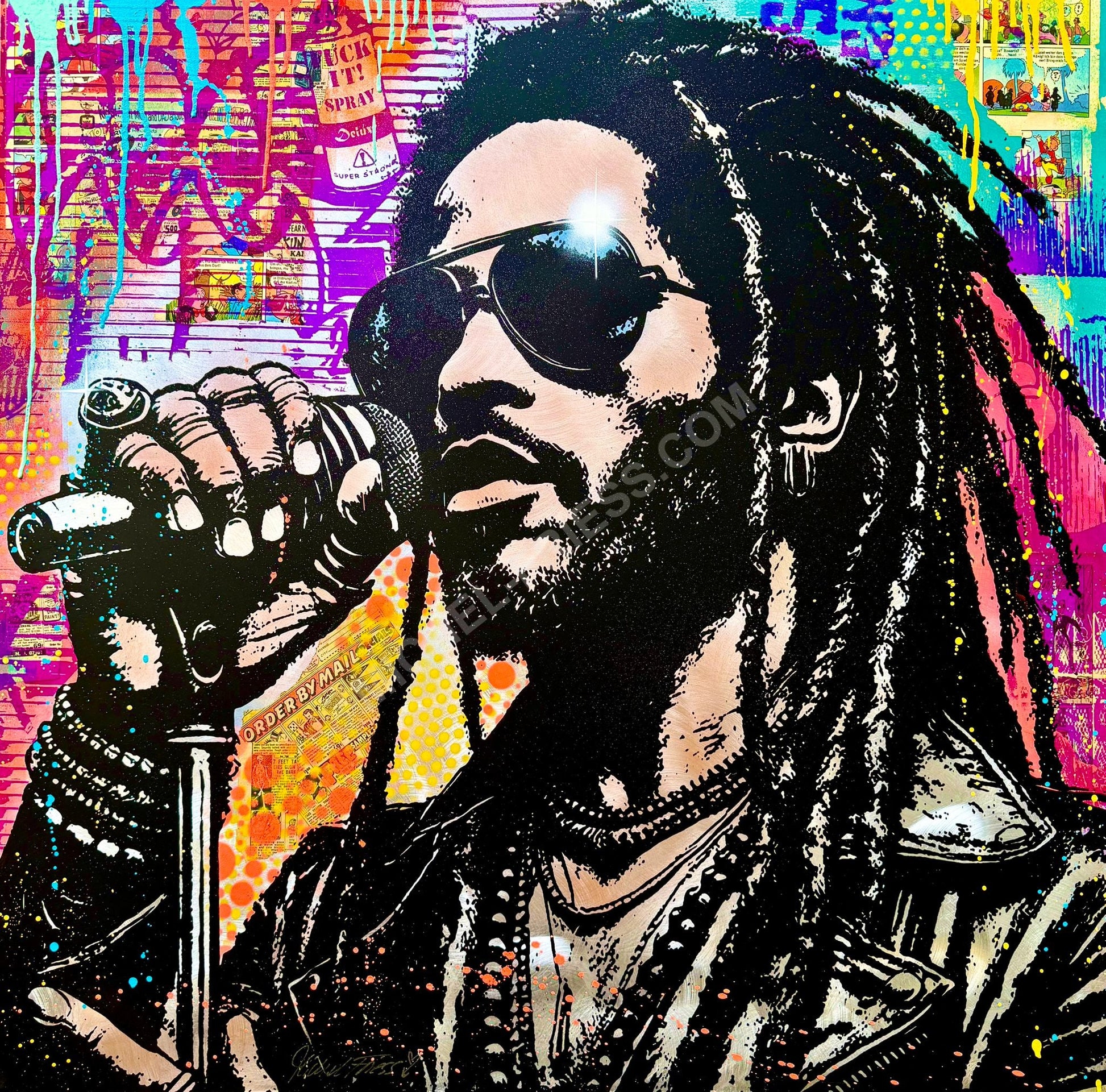 Pure Rock- und Soul-Energie: Dieses Werk zeigt Lenny Kravitz in ikonischer Pose, mit seiner typischen Sonnenbrille, Mikrofon und charismatischer Ausstrahlung. Die knalligen Farben, urbane Graffiti-Elemente und die dynamische Pop-Art-Optik verleihen der Legende einen modernen, explosiven Look. Ein einzigartiges Unikat, das Musikleidenschaft und künstlerische Power in einem Bild vereint. Ein Weltstar.