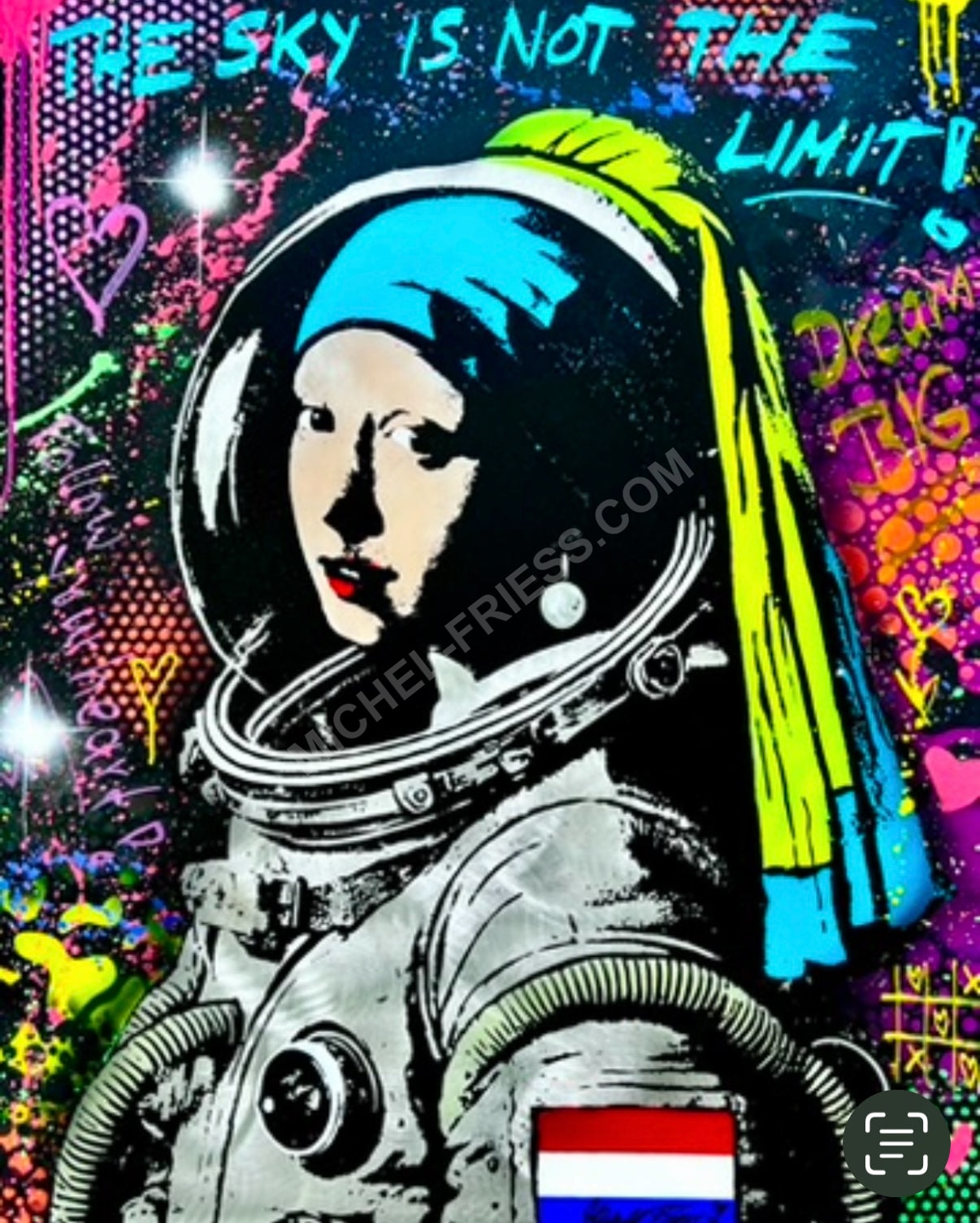 Das weltberühmte „Mädchen mit dem Perlenohrring“ erscheint hier in völlig neuer Dimension – als Astronautin im Pop-Art-Stil. Vergangenheit trifft Zukunft, klassische Kunst verschmilzt mit moderner Street- und Space-Art. Die Botschaft „The sky is not the limit“ macht das Werk zu einem Sinnbild für Mut, Vision und grenzenlose Möglichkeiten. Ein ausdrucksstarkes Sammlerstück für alle, die Inspiration und ikonische Kunst vereinen wollen.
