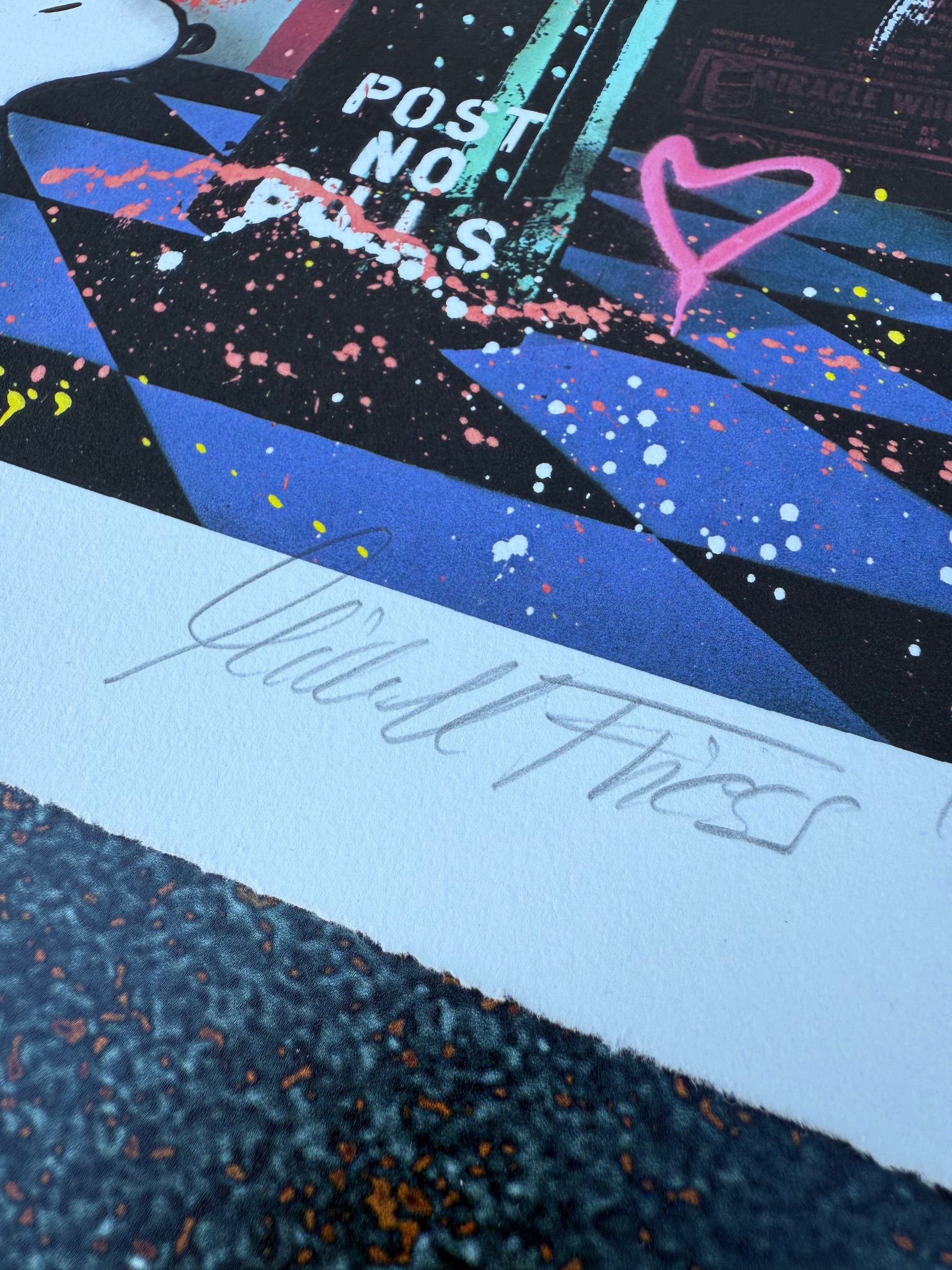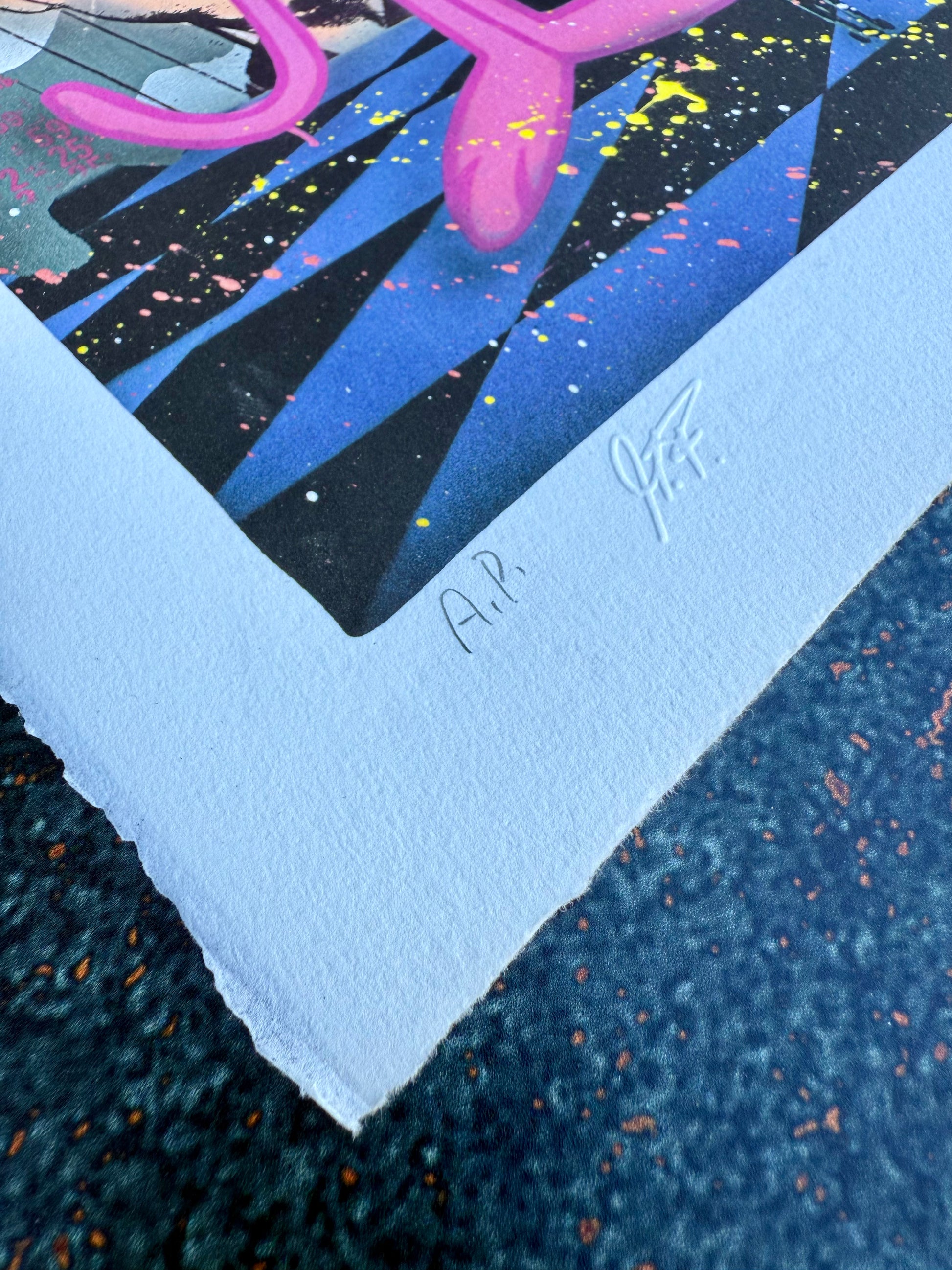 Dieses Kunstwerk zieht den Betrachter mitten hinein in eine Welt, in der Kino, Popkultur und Street-Art verschmelzen. Es ist laut, verspielt, provokant – und ein Stück zeitgenössische Kunst, das den Alltag mit einem einzigen Blick in bunte Energie verwandelt.